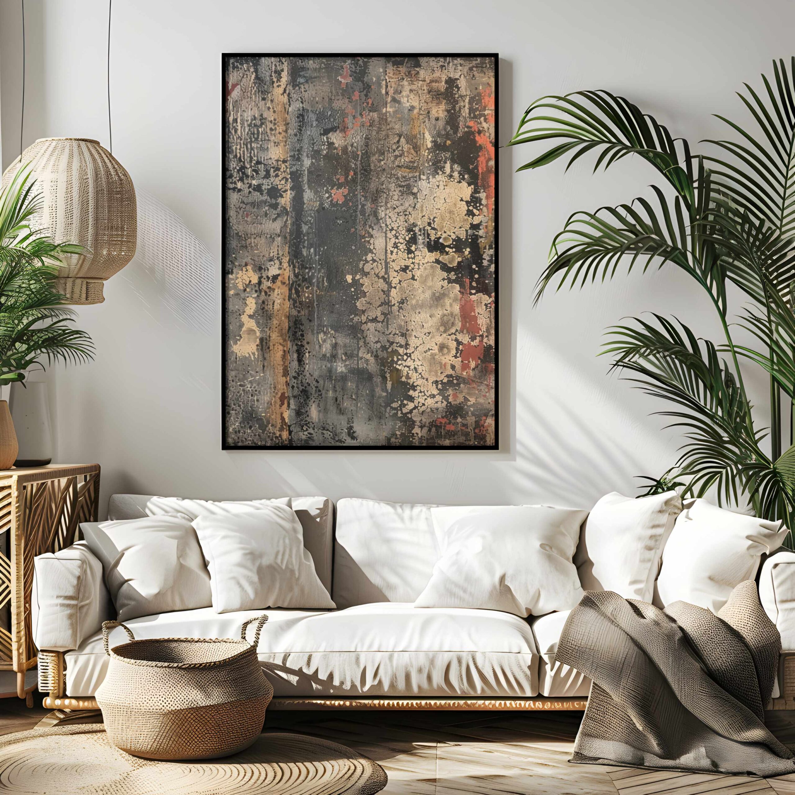 Enhance your home with this industrial abstract wall art, a bold and textured digital artwork designed to bring depth, structure, and modern sophistication to any interior. This high-resolution abstract print features layered distressed textures in black, metallic gold, beige, and rust red, creating a dramatic yet elegantly balanced composition that instantly elevates your space. Perfect for industrial décor, rustic interiors, contemporary apartments, and modern loft-style homes, this artwork adds warmth, contrast, and visual intrigue to living rooms, bedrooms, offices, and creative studio environments.