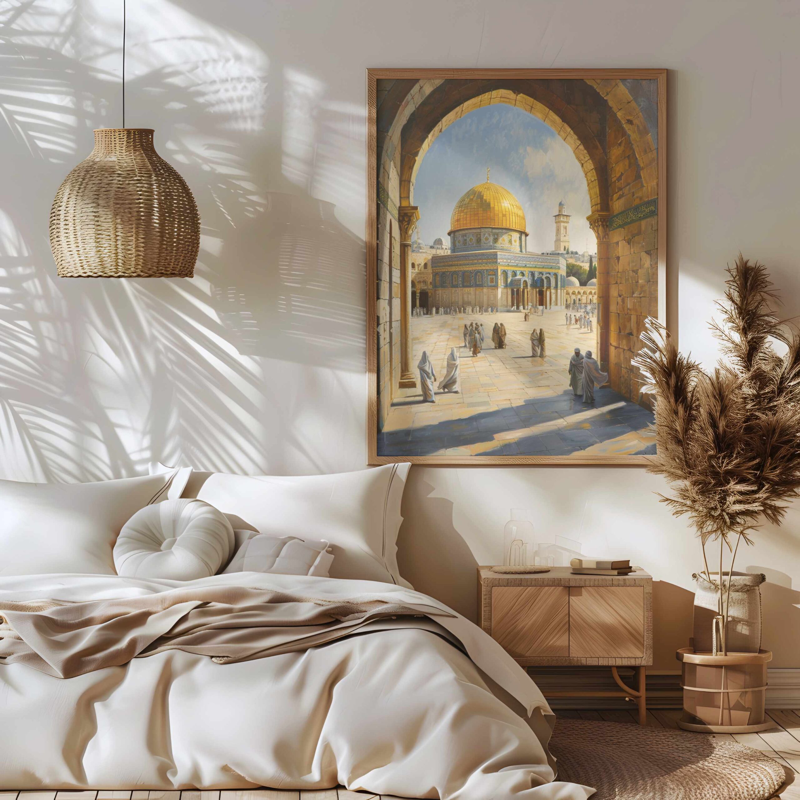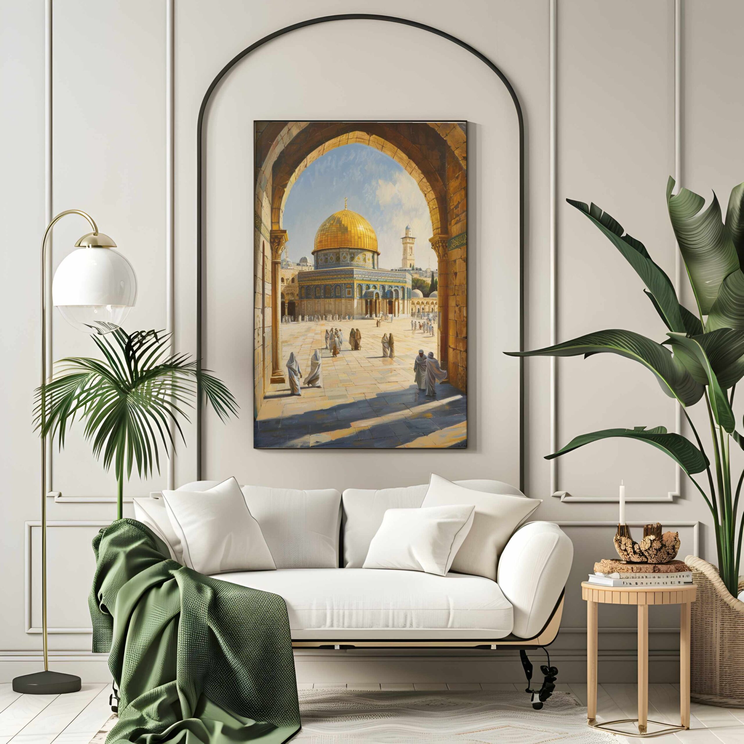 Bring a touch of spiritual elegance into your home with this Masjid Al-Aqsa Islamic Wall Art, a stunning digital oil painting print inspired by the sacred beauty of Jerusalem and the iconic golden Dome of the Rock. Designed for modern and traditional Islamic interiors, this Jerusalem Islamic wall art reflects history, devotion, and timeless architectural splendor.