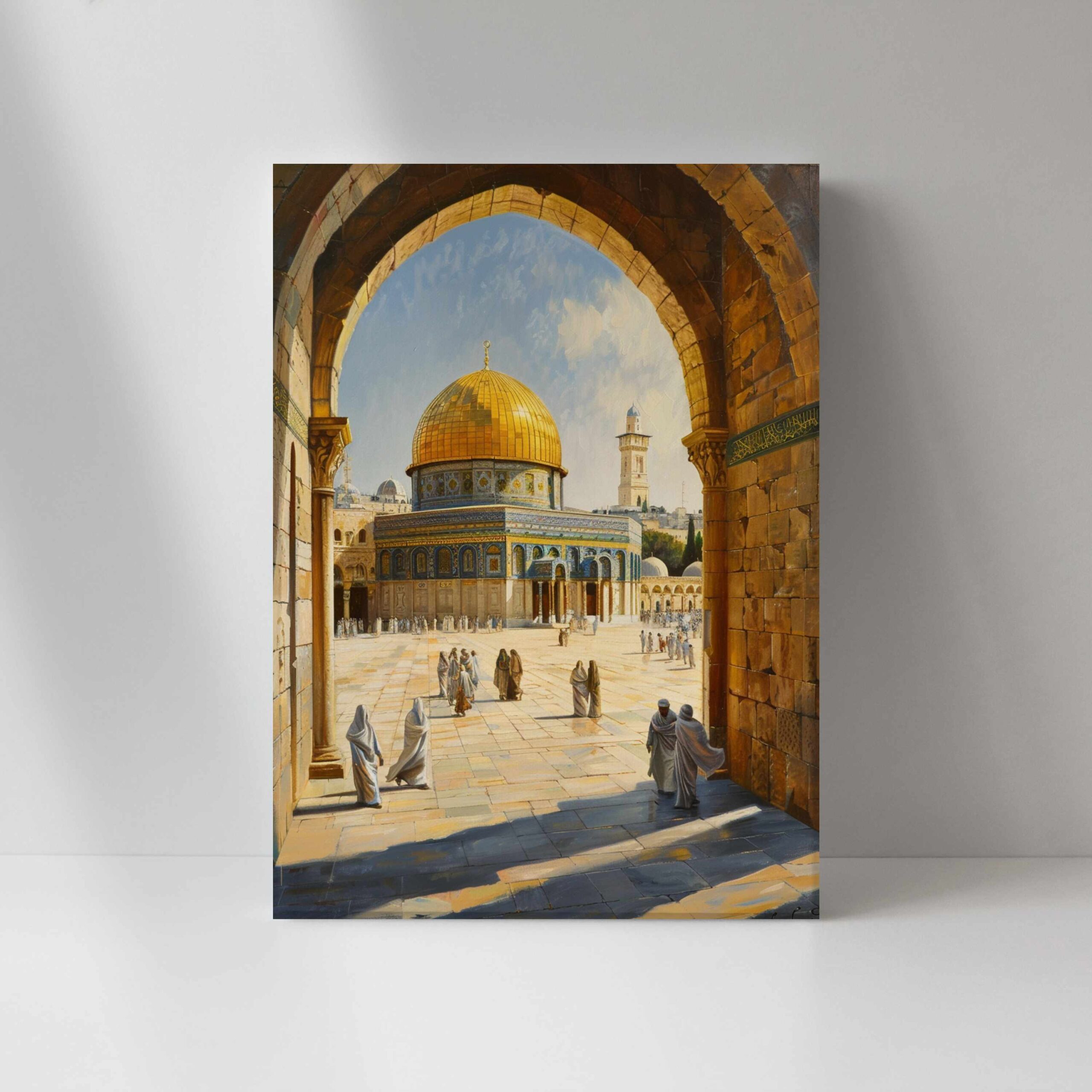 The artwork portrays a breathtaking view of the Dome of the Rock bathed in warm sunlight, framed beautifully through an ancient stone archway. The golden dome glows against a soft blue sky, while figures dressed in traditional robes walk peacefully across the marble courtyard — symbolizing faith, serenity, and spiritual connection. This visually rich Masjid Al-Aqsa wall art printable captures both the emotional and historical significance of one of Islam’s holiest sites, making it a meaningful addition to any Muslim home.